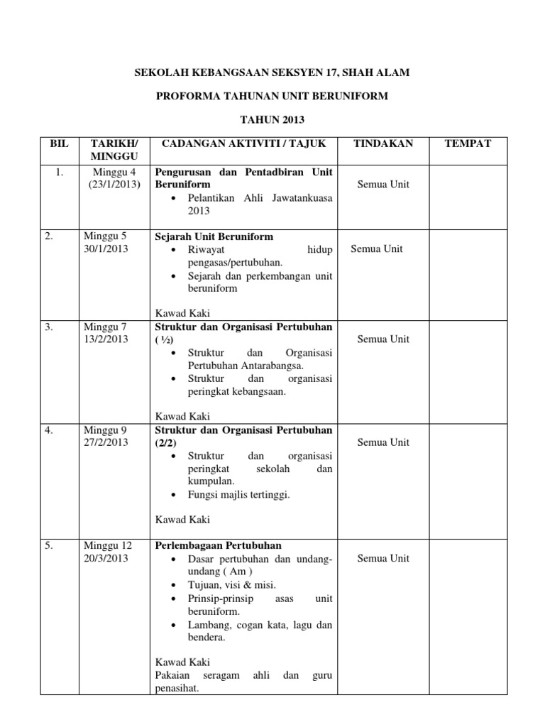 Perancangan Tahunan Aktiviti Unit Beruniform Sekolah Rendah 2013