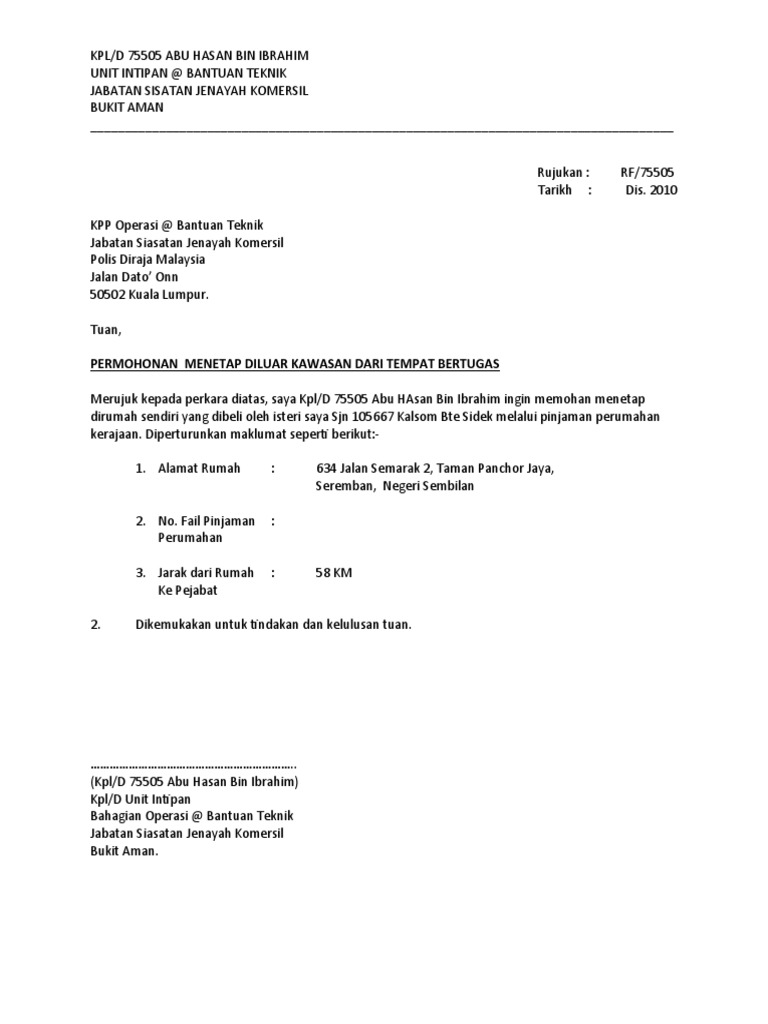 Contoh Surat Rayuan Pertukaran Anggota Polis Persoalan T