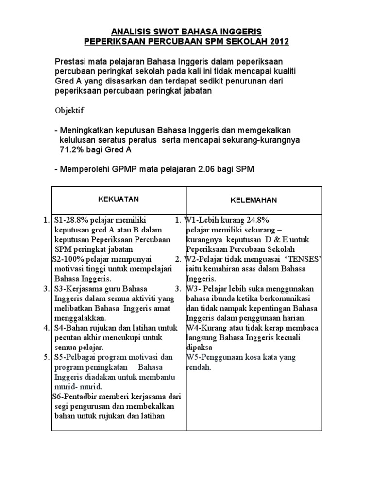 Contoh analisis swot bahasa melayu salam 1 malaysia entri cikgu sherry hari ini ialah mengenai contoh swot yang saya buat untuk subjek bm di sekolah saya. Ujian diagnostik bahasa melayu pengamatan. Set soalan ujian diagnostik bahasa melayu.