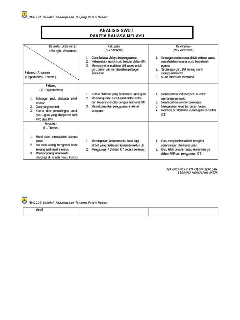 Analisis Swot Panitia Bahasa Melayu Kekuatan Kelemahan Strength Weakness Kekuatan Kelemahan