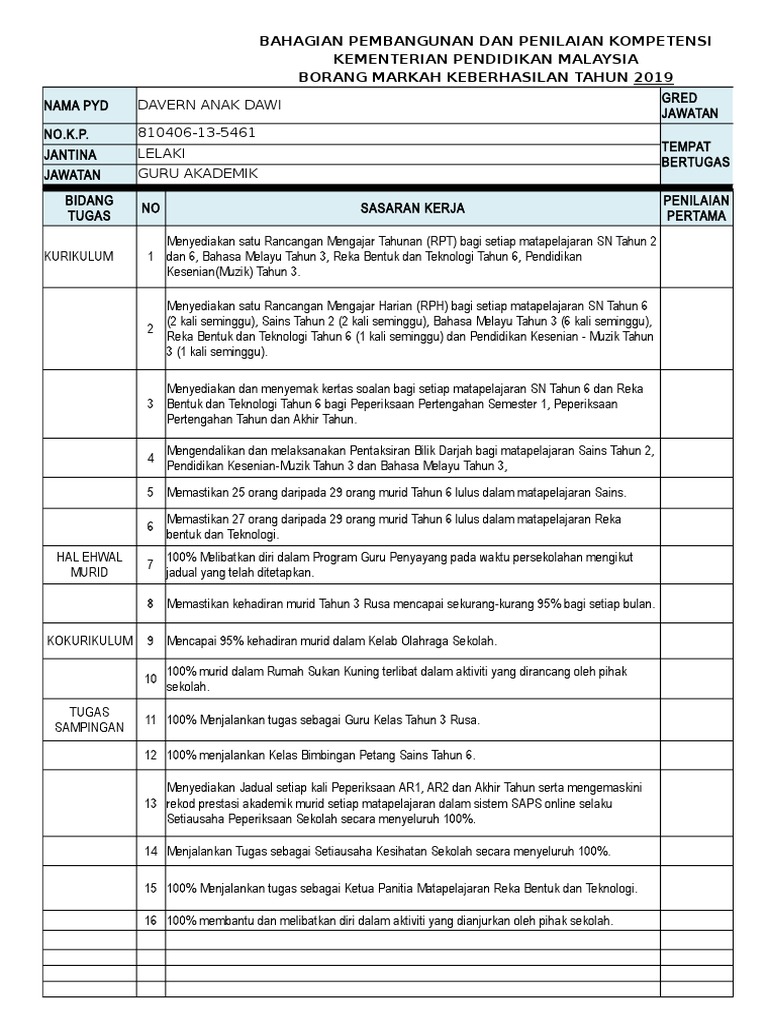 Bahagian Pembangunan Dan Penilaian Kompetensi Kementerian Pendidikan Malaysia Borang Markah Keberhasilan Tahun 2019