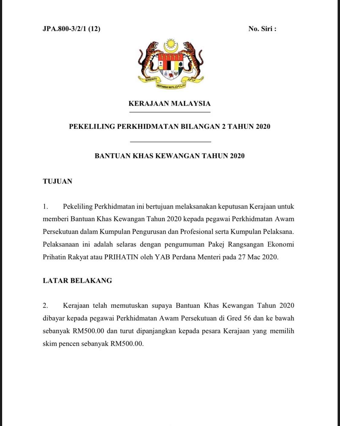 Bantuan Khas Kewangan Prihatin 2020 Rm500 Untuk Penjawat Awam Dan Pesara Info