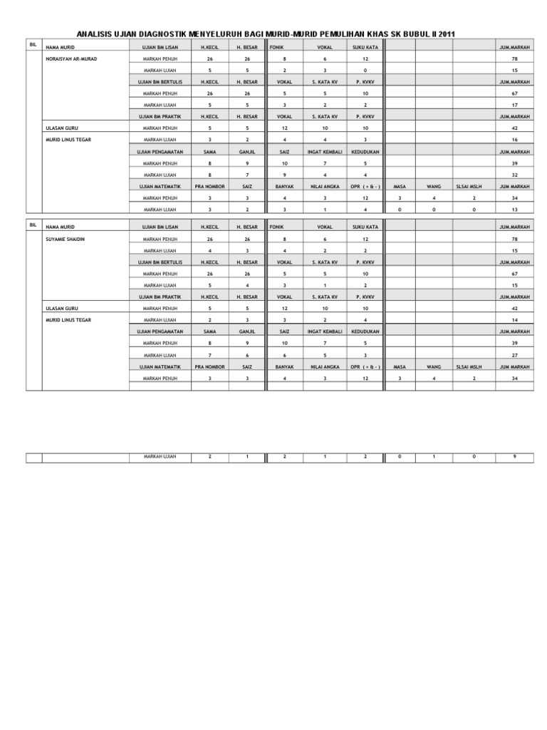 Analisis Ujian Diagnostik Menyeluruh Bagi Murid Murid Pemulihan Khas Sk Bubul Ii 2011