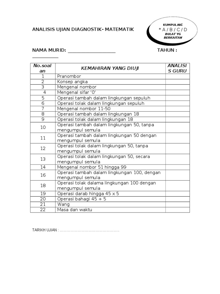 Doc Borang Rekod Ujian Diagnostik Matematik Muhd Fitri Academia Edu