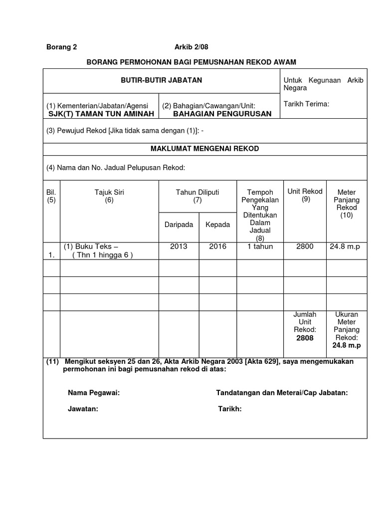 Subperaturan 6 2 Borang 2 Arkib 2 08 Borang Permohonan Bagi Pemusnahan Rekod Awam