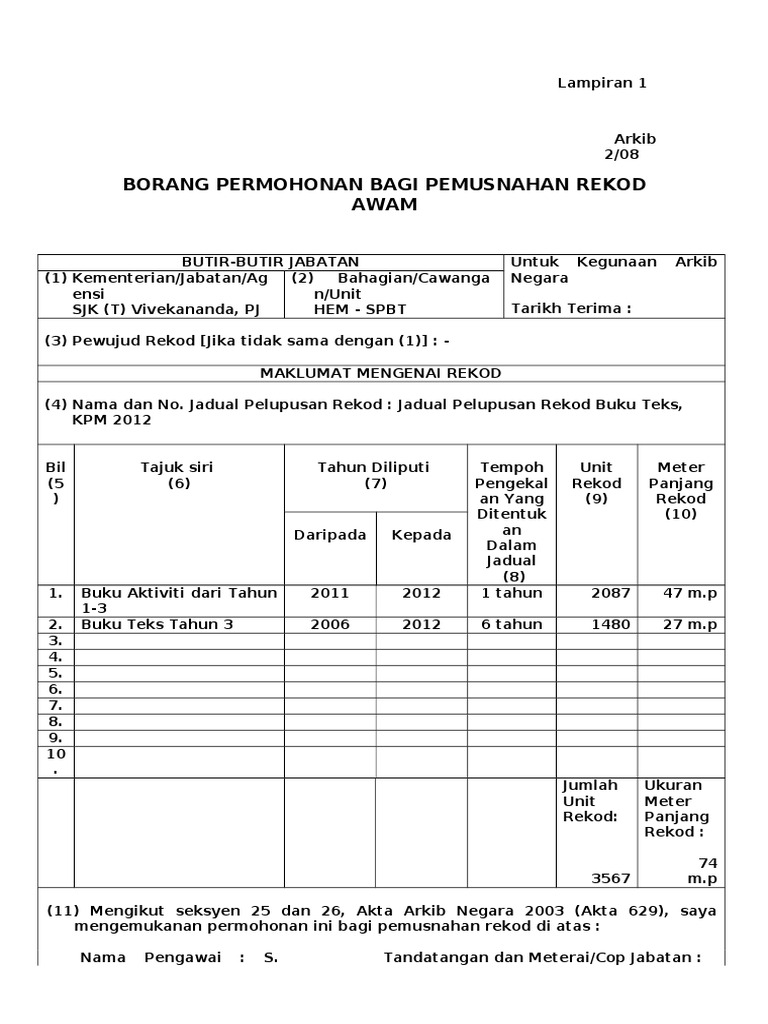 Doc Lampiran 2 Contoh Arkib 2 08 Borang Permohonan Bagi Pemusnahan Rekod Awam Manisah Abdullah Academia Edu