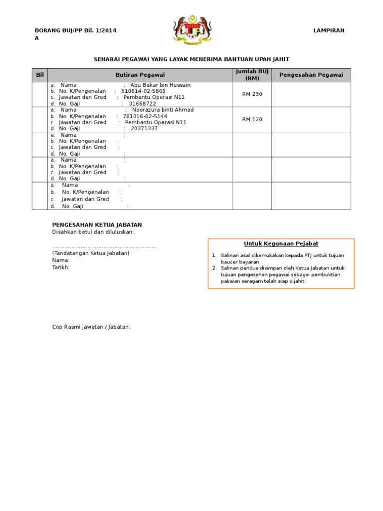 Borang Buj Upah Jahit Baju