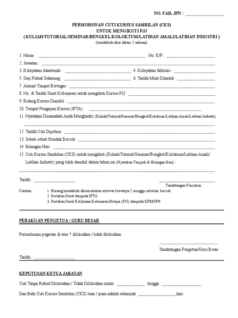 Borang cuti kursus sambilan kpm. Borang permohonan cuti belajar akademik 1 1 1 1 1 1 2. Pekeliling kemudahan tambang mengunjungi wilayah asal bagi pegawai yang bertukar wilayah. Borang permohonan mengikuti kursus dalam perkhidmatan.