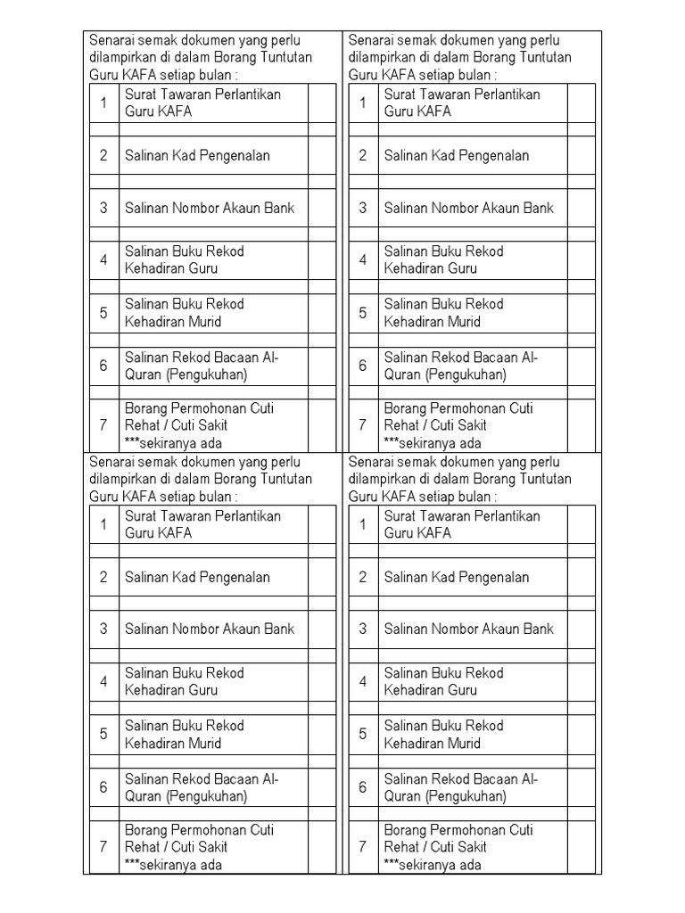 Senarai Semak Dokumen Yang Perlu Dilampirkan Di Dalam Borang Tuntutan Guru Kafa Setiap Bulan