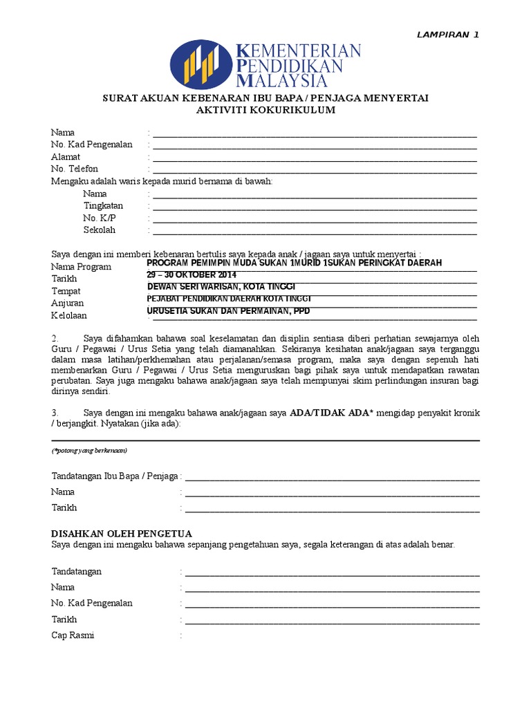 Surat Kebenaran Ibu Bapa Standard Jabatan Pelajaran Selangor