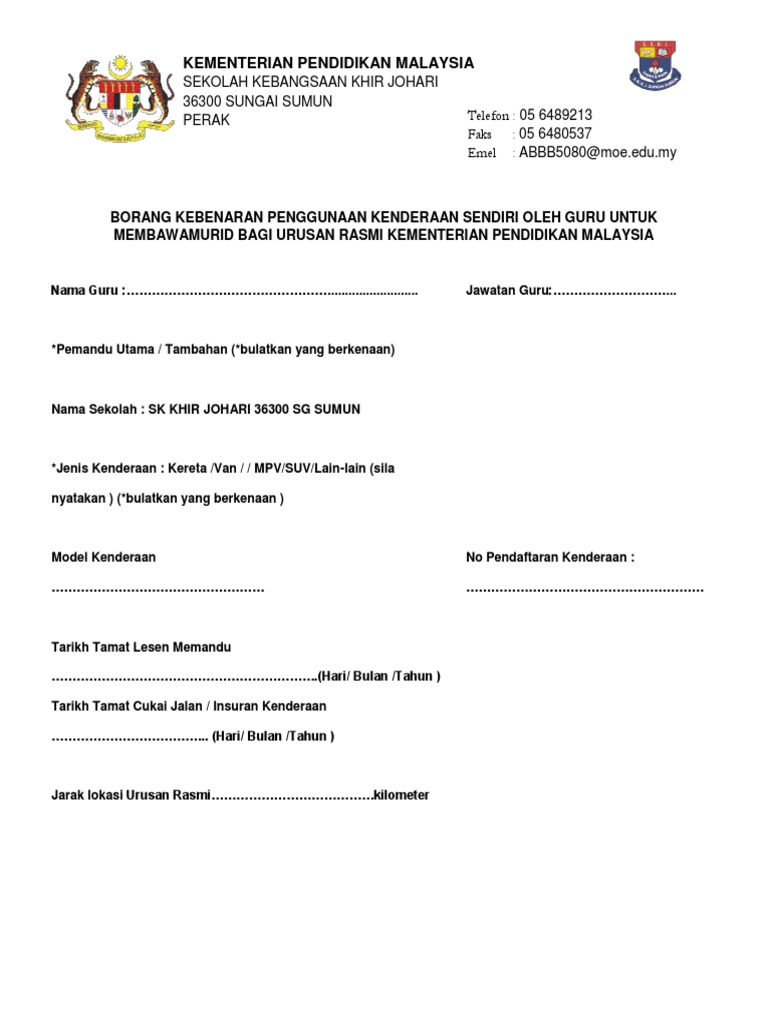 Borang Kebenaran Penggunaan Kenderaan Sendiri Oleh Guru Untuk Membawamurid Bagi Urusan Rasmi Kementerian Pendidikan Malaysia
