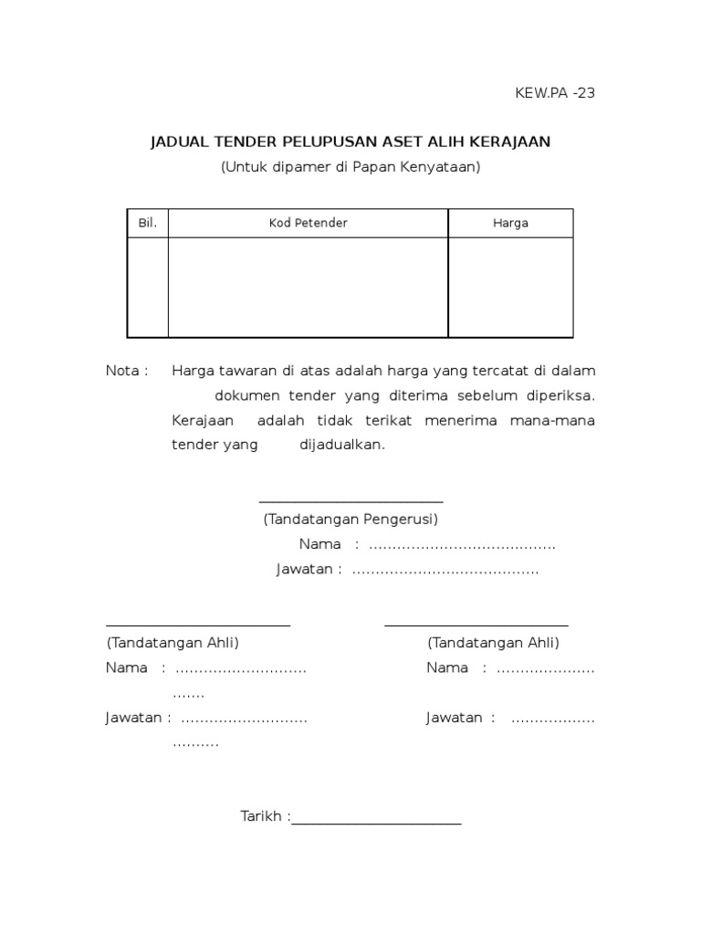 23 Kew Pa 23 Jadual Tender Pelupusan Aset Alih Doc