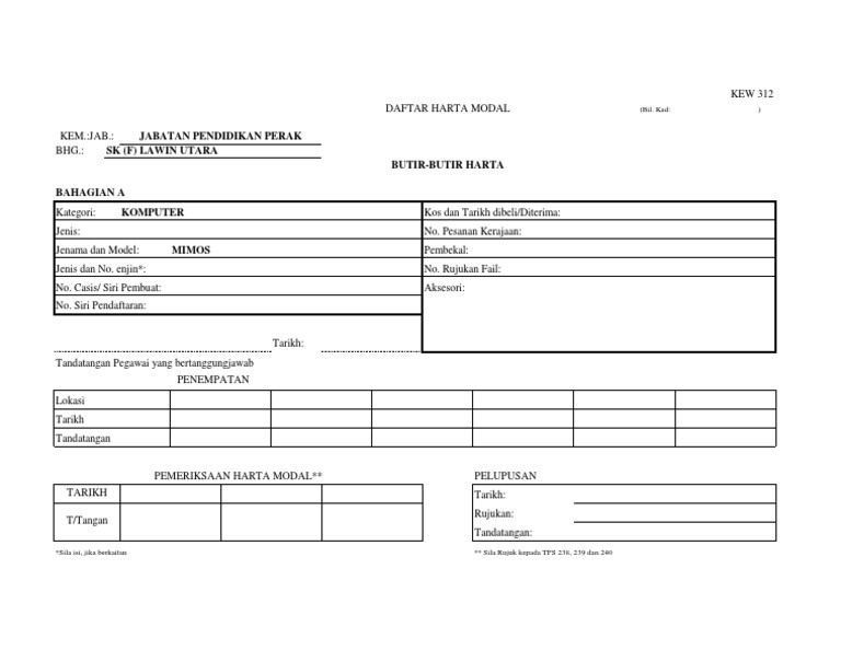 Contoh Borang Daftar Harta Modal Kew 312