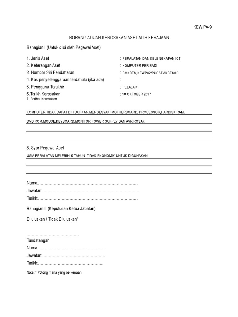 Kew Pa 9 Borang Aduan Kerosakan Aset Alih Doc
