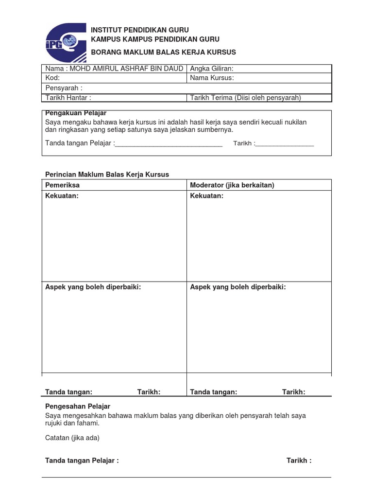 Doc Institut Pendidikan Guru Kampus Pulau Pinang Borang Maklum Balas Kerja Kursus Projek Amali Edup 3053 Academia Edu