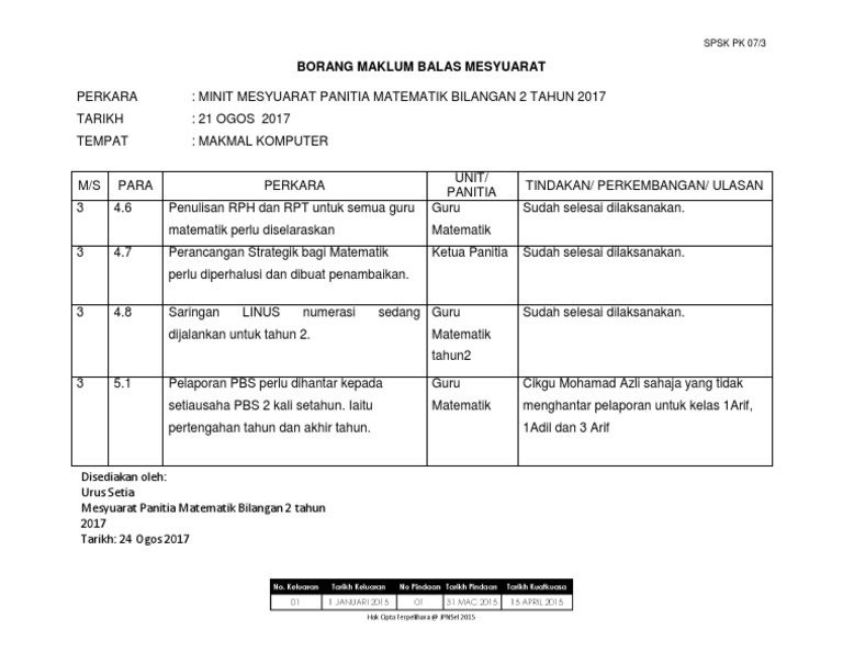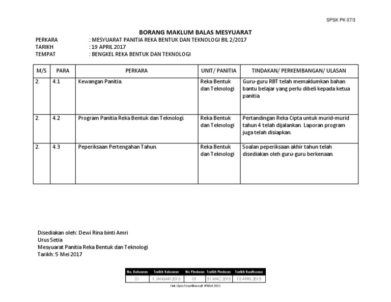 Borang Pk 07 5 Maklum Balas Minit Mesyuarat Kali Pertama 2017