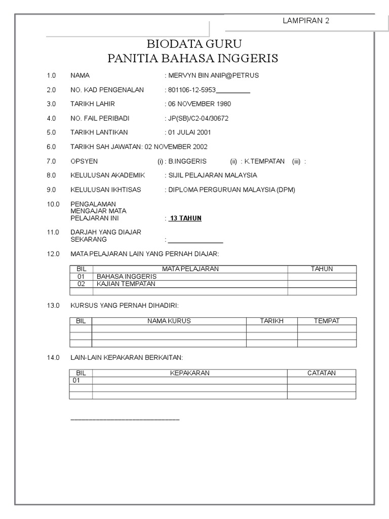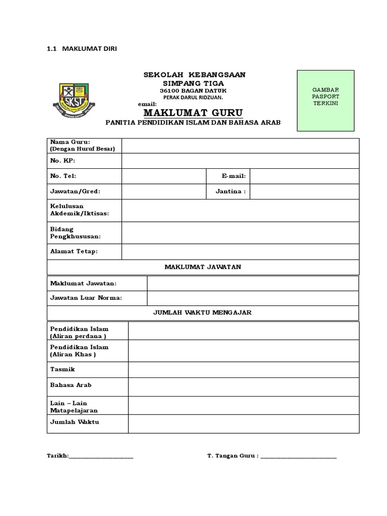 Doc Borang Maklumat Peribadi Guru Bil Butir Peribadi Hamzah Hamat Academia Edu