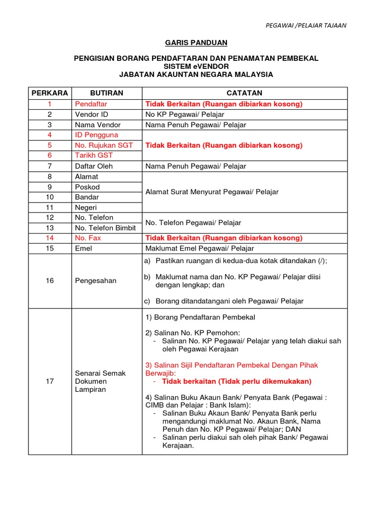 Garis Panduan Pengisian Borang Pendaftaran Dan Penamatan Pembekal Sistem Evendor Pegawai Pelajar Tajaan Jpa