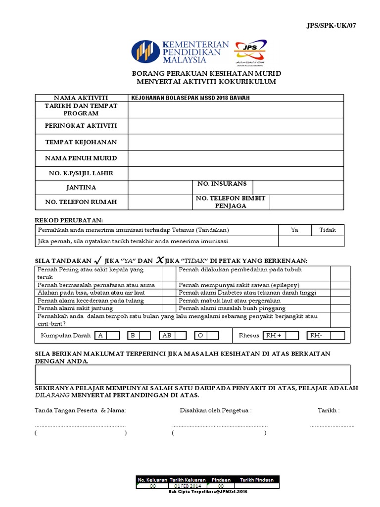 Surat Akuan Kebenaran Ibu Bapa Penjaga Lampiran 2 Borang Perakuan Kesihatan Murid Sebelum Menyertai Aktiviti Kokurikulum Luar Nama Aktiviti Tempat Aktiviti Peringkat Aktiviti Tarikh