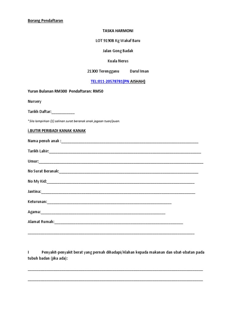 Borang Permohonan Contoh Borang Pendaftaran Taska