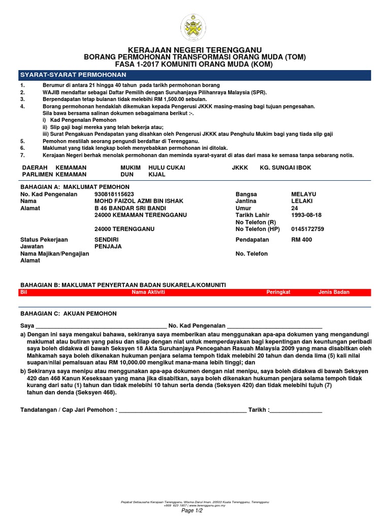 Pdf Kerajaan Negeri Terengganu Borang Permohonan Transformasi Orang Muda Tom Fasa 1 2017 Komuniti Orang Muda Kom Syarat Syarat Permohonan Muhammad Zakwan Academia Edu