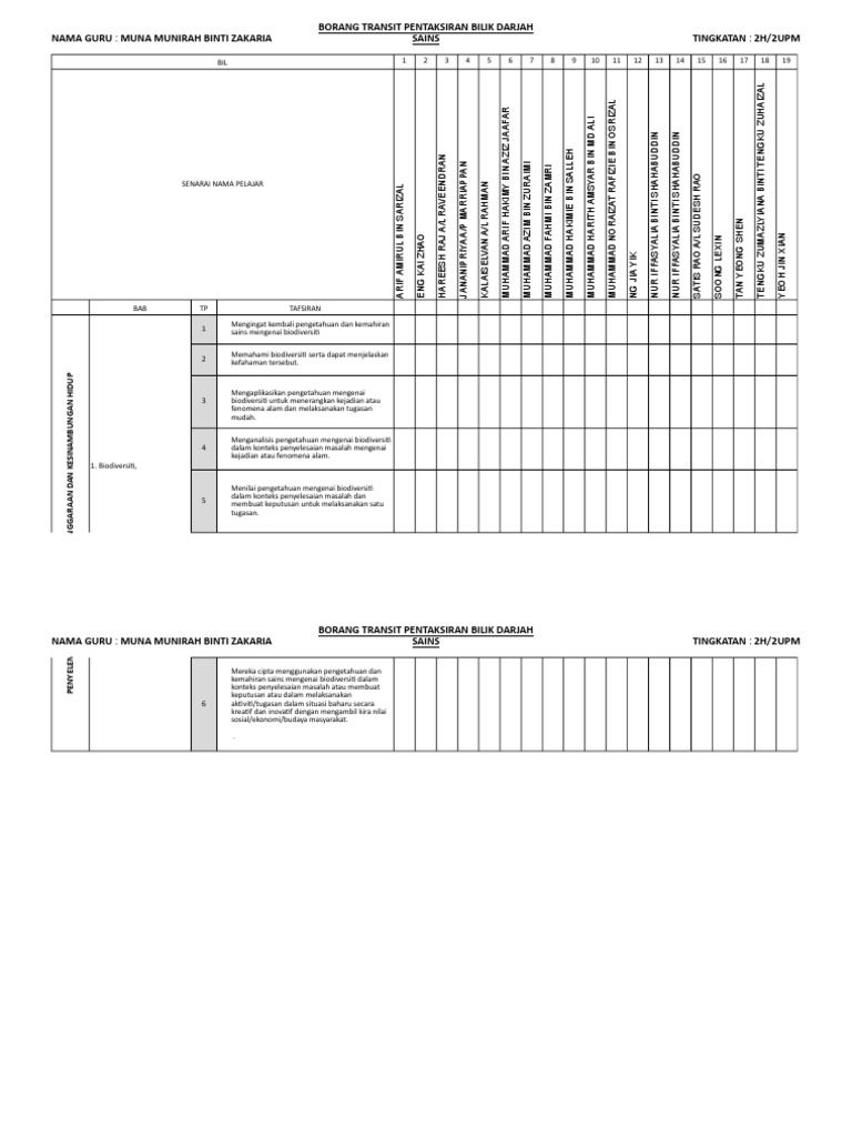 Borang Transit Pentaksiran Bilik Darjah Sains F2h