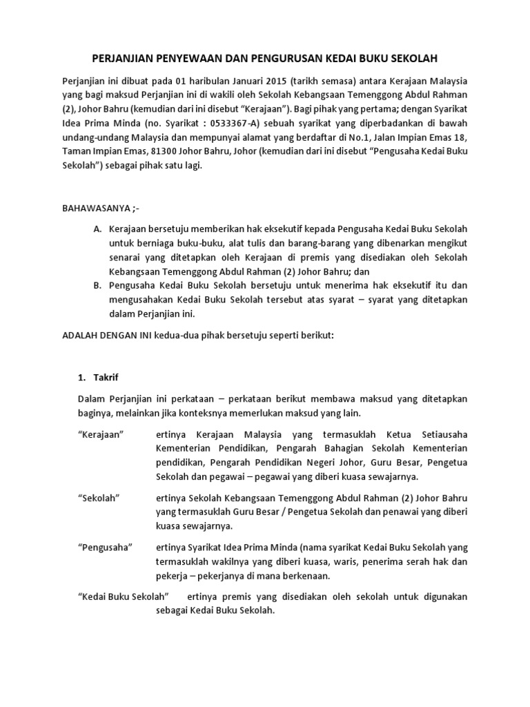 Perjanjian Penyewaan Dan Pengurusan Kedai Buku Sekolah 2016