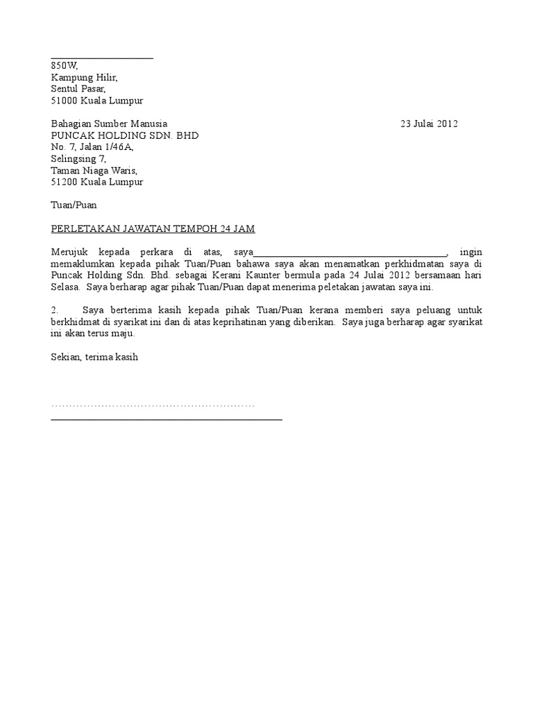 Surat Berhenti Kerja Contoh Rasmi Notis 24 Jam Sebulan